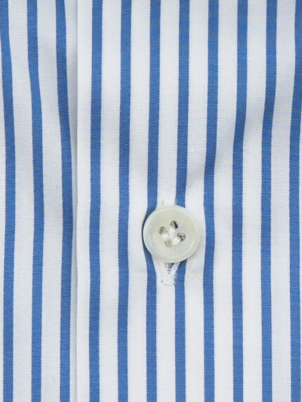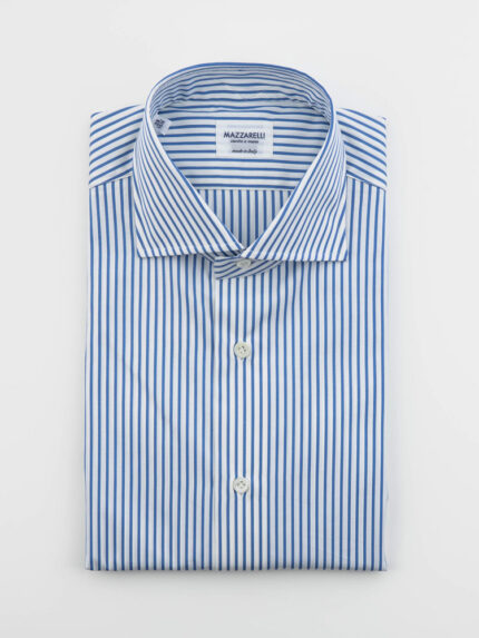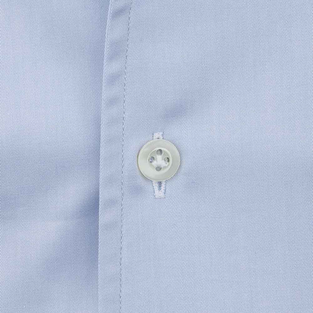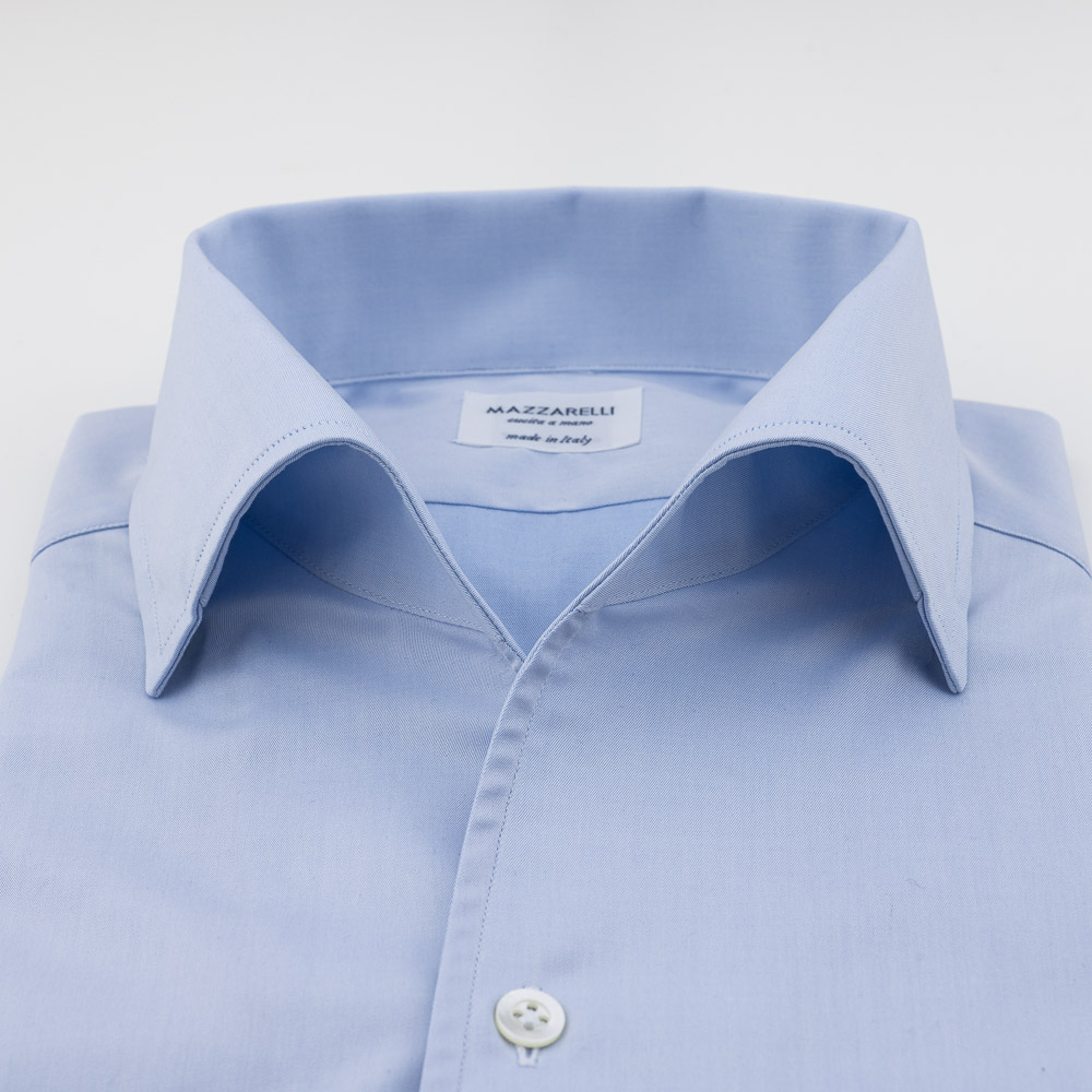 Light blue twill fabric shirt from Thomas Mason’s Journey collection whit bowling collar. This shirt, designed for the stylish and cosmopolitan man, can be stored in a suitcase for a long time without compromising its appearance, thanks to its specific anti-fold fabric. Classic shirt handcrafted exclusively in Italy with hand-sewn armholes, long sleeves and rounded hem.