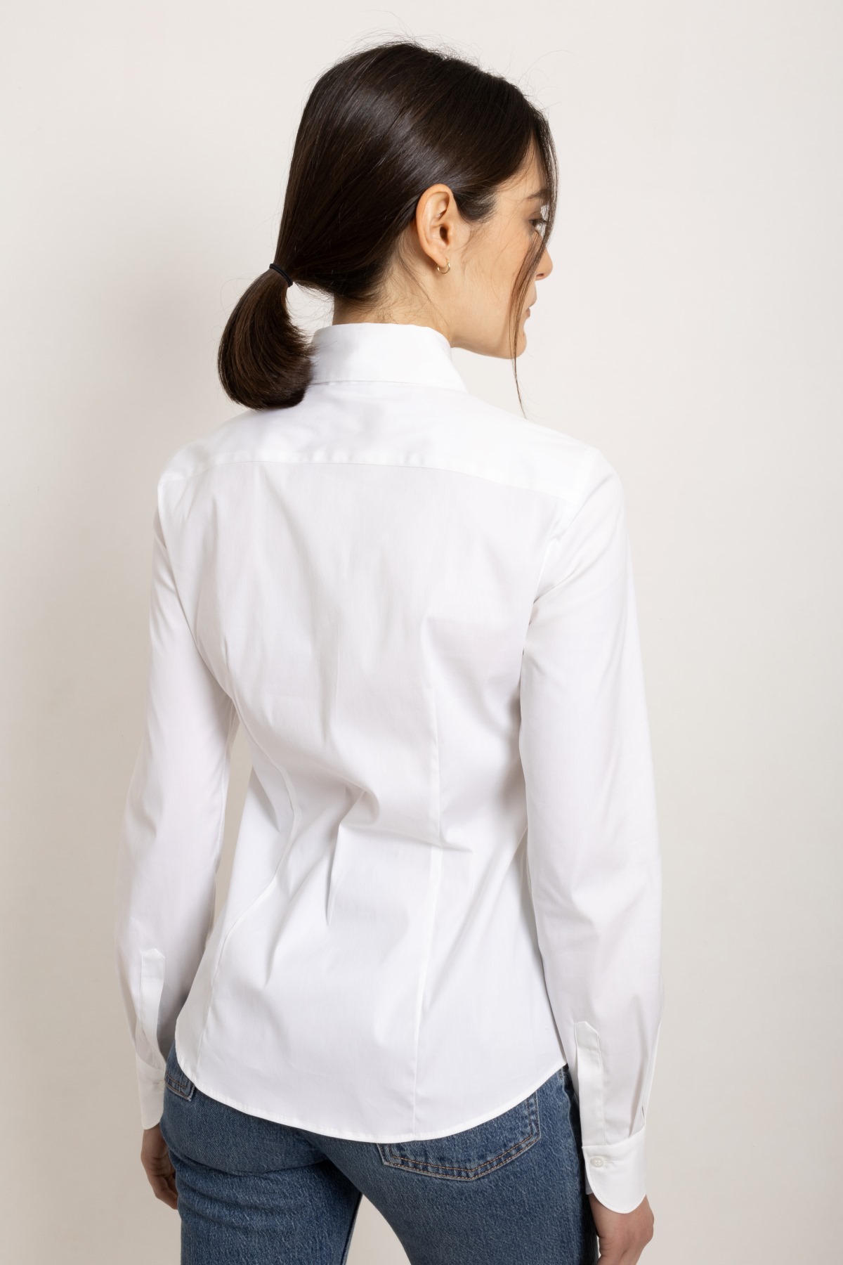 La camicia Clio realizzata in un pregiato cotone elasticizzato, offre una vestibilità aderente, esaltando la silhouette femminile con eleganza. La morbidezza del tessuto, combinata con la sua elasticità, garantisce una sensazione di comfort impeccabile, senza comprometterne la forma. La vestibilità sfiancata assicura una linea moderna e slanciata. Un capo che unisce stile e praticità in un perfetto equilibrio tra comfort e raffinatezza. Questo capo è realizzato in modo artigianale esclusivamente in Italia